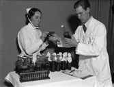 "Personalen på Ulleråker lämnar blod till armén" - sjuksköterskan Karin Bengtsson och läkaren Thore Gustafsson testar blod som personalen på Ulleråkers sjukhus lämnat, Uppsala oktober 1941