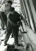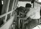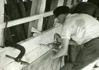 Sjötorps varv. "Sätta till en bordvägsgång" på backen till isländskt fiskefartyg under byggnad. Bordplankan borras för spikning.