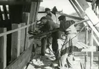 Sjötorps varv. "Sätta till en bordvägsgång" på backen till isländskt fiskefartyg under byggnad. Bordplankan borras för spikning.