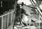 Sjötorps varv. "Sätta till en bordvägsgång" på backen till isländskt fiskefartyg under byggnad. Bordet pressas in med hjälp av en "bändhake" och fästes med tvingar.