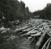 Flottning av timmer i Hjorted. Kortet är taget vid Kvarnbrons sågverk strax utanför Hjorteds samhälle på vägen mot Falsterbo.