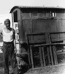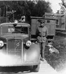 Vid burarna med 250 stycken duvor står brevduvespecialisten och posttjänstemannen Wilhelm Jonasson från Stockholm Ban. I bakgrunden stationsbyggnaden med åskådare i väntan på invigningsceremonien. Hela brevduveflocken släpptes upp efter Kungens invigningstal.
