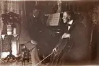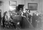 Dansband. Början till Falköpings orkesterförening. I bakre raden ses sångerskan Elisabet Sahlqvist längst till höger. Från vänster i främre raden ses Arvid Pompejus, Paul Sahlqvist, Emil Nyrén och Britta Brandt. Hemma hos Sahlqvist, på juletid Trädgårdsgatan 3 (på Mösseberg) sedan västra Trädgatan, nu Afzeligatan 3.