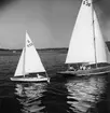 Centerbordseka byggd av Sven och Olle Lundgren, LÖA (längd över allt) 5,30 m ute på en seglats. Båthus och andra byggnader i bakgrunden på land, 1940.