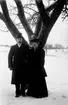 En man i en cylinderhatt och en kvinna står vid hörnet av Västra Sjögatan och Södra Långgatan.