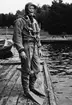 Bilden föreställer en besättningsman i dykarutrustning under minfartyget Älvsnabbens långresa 1966-1967.