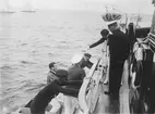 Kung Gustaf V anländer med motorbarkass till pansarskepp (sannolikt SVERIGE) och hälsas av blåsorkester och officerare i paraduniform. Tid, plats och sammanhang okända. Se även Fo229269C från samma tillfälle.