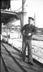 Bilden visar en smutsig skeppsgosse med bar överkropp och arbetsbyxor. I bakgrunden syns gamla mastkranen.
