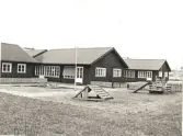 Två utställningar på Lindome bibliotek, år 1985. "Cecilia Lindén beskådar färglådan med specialglasögon." För mer information om bilden se under tilläggsinformation.