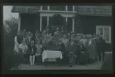 Medföljande text: "Fotografi taget i anledning av J W Bergs 60-årsdag 1945 på trappan utanför hans hus. 1. Lennart Berg, yngste son till J W Berg, 2. Elon Johansson, 3. Johansson (Nordensjö), bror till 33:s fru, 4. Östen Berg, son till J W Berg, 5. Åke Johansson (Wallsten), bror till 3, 6. Bertil Kristiansson, svetsare, ordf. i fackf. 7. Valter Berg, son till J W Berg, 8. Ingmar Kristiansson, 9. Agne Hilmersson, svarvare, 10. Karl Lennart Karlsson, montör, 11. Folke Olofsson, svetsare, kusin till 33, 12. Harry Skog, Borlänge (ej på Bergs, gift med J W Bergs dotter), 13. Hjalmar Hermansson, timmerman, kom från Tjörn, 14. Adolf Andersson, timmerman, 15. Johan Wiktor Berg, direktör, 16. Sven Pettersson, svetsare, 17. Josef Olsson, drivare, 18. Oskar Olofsson, timmerman, 19. Bertil Gustavsson, svarvare, 20. Okänd, 21. Sven Olsson, drivare; son till 17, 22. Manfred Andersson, 23. montör, 24. Okänd, 25. John Svensson, 26. Oskar Jansson, 27. Mauritz Johansson, timmerman, 28. Arvid Olsson "Drivar-Arvid", drivare, 29. Sven Olsson, 30. Okänd, 31. Allan Alhberg, timmerman, 32. Okänd, 33. Erlend Andreasson, montör, 34. Oskar Karlsson, sågare, 35. Lindberg, fru till 44, 36. Harry Andersson, timmerman, flyttade till Småland, 37. äldsta dotter till J W Berg, gift med 12, 38. Henning Eriksson, gjutare, 39. Folke Karlsson, snickare, 40. Karl "Sme-Kalle" Gustavsson, smed, 41. Eisten Sjödell, snickare, 42. Fredrik Klar, timmerman, 43. Sigvard Olofsson, montör (propellrar), 44. Lindberg, bokhållare, 45. Almén, svarvare, 46. Alfred Olsson, snickare, 47. Johan Sundberg, svarvare, 48. Albin Ahlberg, montör, 49. Karl Hilmersson, målare, 50. Martin Johansson, timmerman, 51. Algot Pettersson, körde timmerbåten, 52. Torsten Almqvist, montör, 53. Adel Svenningsson, montör, farbror till 67, 54. Harry Karlsson, timmerman, 55. Albert Johansson, kom från Bleket, Tjörn, kallad Blearn, 56. Okänd, 57. Johan Olsson, sågare, (skötte ramsågen), 58. Verner Almqvist, 59. Reinold Olsson, 60. Karlsson (Solbräcke), kom från Eriksberg våren 1945, 61. Karl "Nilsson" Gustavsson, plåtslagare, 62. Hjalmar Ahlqvist, 63. Torsten Österberg, 64. Olle Berg, svarvare, sedan kontoret, brorson till J W Berg, 65. Okänd, 66. Okänd, 67. Oskar Svenningsson, timmerman, kom från Knippla, förman på Björkö. Ägare till bilden: Östen Berg, Hälsö. Uppgiftslämnare: Östen Berg och Erland Andreasson, Hälsö.