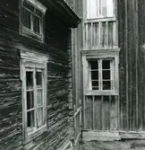 Gavel till boningshuset till Östberga gård med kontursågade fönsterfoder och takbrädor. Bilden tagen inför rivning hösten 1959.