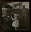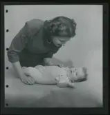 513 B Red. Karlströmer. En bebis sitter i knät på en kvinna och sträcker sig efte ren blombukett på bordet.