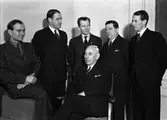 Föreläsarna på Hushållningssällskapets informationsdag - agronom C G von Hofsten, professor Hugo Osvald, professor G Torstensson, förvaltare Gottfrid Carlsson, husdjurskonsulent S Lindén och jordbrukskonsulent Göran Knutsson, sal X, Universitetshuset