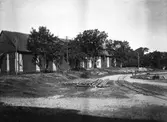 Vägstation G4, Bergsnäs, depåförrådet. Gårdsmiljö innanför nätstängsel. Decauvillevagnar (tippvagnar) uppställda. Öppet förrådsskjul.