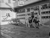 Militärer vid kanon utanför Upplands Regementes "Landsbygdens försvarsutställning", Svartbäcksgatan 25