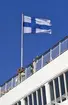 Porträtt av Chatarina Lejonhuvud utanför Gyllene Uttern. Hon står utomhus. Bakom sig har hon en finsk, svensk och norsk flagga vajandes i vinden.