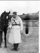"Meche" i Finsk uniform hälsar på hemma i Skövde. Här på K 3 kaserngård med älsklingshästen "hoppsan". Melker Wernstedt, officer vid K 3 1932 - 1940.