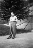 "Karantänsförläggning" på Kvarnbyskolan för flyktingar från koncentrationsläger i Tyskland 1945. En manlig flykting utomhus.