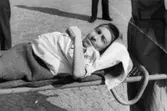 "Karantänsförläggning" på Kvarnbyskolan för flyktingar från koncentrationsläger i Tyskland 1945. En manlig flykting som ligger på en bår.