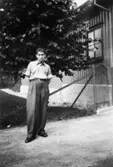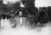 "Karantänsförläggning" på Kvarnbyskolan för flyktingar från koncentrationsläger i Tyskland 1945. Manlig flykting utanför ett hus.