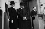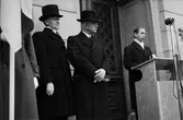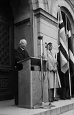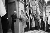 "Freden värdigt firad i Upsala" - universitetsrektor Nils von Hofsten talar, Universitetshusets trappa, Uppsala 8 maj 1945