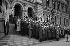 "Freden värdigt firad i Upsala", Allmänna sången sjunger "Stå stark du ljusets riddarvakt" på Universitetstrappan, Uppsala 8 maj 1945