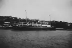Foto i svartvitt visande passagerarmotorfartyget FREM av Rönne i Köpenhamn under 1930 talet.