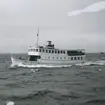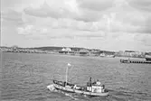 Göteborgs Örlogsdepå. H.M. Hjvb 384. På gång i Göteborgs södra skärgård mot Göteborg. Det eskorterade fartyget följer i eskortfartygets kölvatten. Det går med båtarna i utsvängda dävertar.