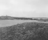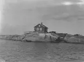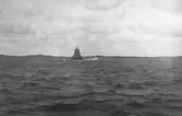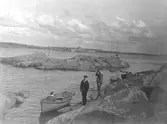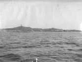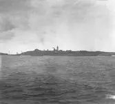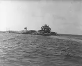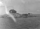 Göteborgs Örlogsdepå. H.M. Hjvb 384:s resa. Gång inomskärs i Göteborgs södra skärgård. Ett eskorterat fartyg följer i leden.