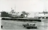 Kyrkogatan i Gävle, där Kyrkogatan mynnar ut på Centralplan med adress Kyrkogatan 30, kv Norra Varvet. Till höger dåvarande entrén till Centralcaféet. I bakgrunden Gamla Grand Hotel. Den 1 december 1937.