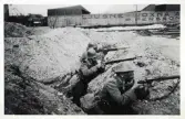 "Gasskyddsövning." Tre man med gasmask m.m. har förskansat sig i ett skyttevärn. Malmö hamn (?).