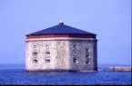 Konteramiral Samuelson färdas i en mindre båt tillsammans med en grupp uniformsklädda militärer. I bakgrunden skymtar befästningstornet Godnatt.