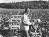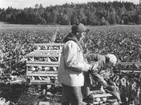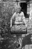 "Nyskördade tomater. Maj Britt Karlström har nu bråda dagar när tomaterna skall skördas." Mölndal, år 1984. Fotografi taget av Harry Moum, HUM, för publicering i Mölndals-Posten, vecka 31, år 1984.