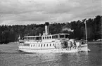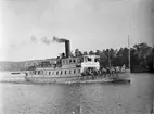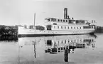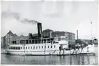 Gustavsbergsbåt vid kajen. Statbyggningen och Ekensberg till vänster, Värdshuset till höger i bakgrunden och Gula byggningen skymtar till höger.