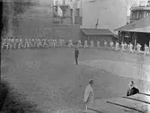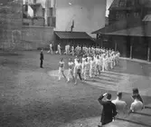 Gymnastiska central institutet. Män utövar gymnastik på gårdplan omgiven av hus under 1911-1912, alla klädda i vita träningskläder. Bredvid står tre män och inspekterar.
