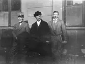 Tre engelsmän poserar fint framför byggnad under 1911-1912. Samtliga iklädda kostym enligt mode. (Gymnastiska Central institutet).