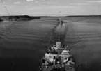 Från Hårsfjärdens marinbas, sundet mellan Märsgarn och Vitsgarn. Fiskebåten till v samt det stora segelfartyget i bakgrunden har inte kunnat identifieras. Framför segelfartyget ses tre fartyg ur flottan, varav de två första är minsvepare av Sökaren-klass; det närmaste, med ik-nummer 18, är SPRÄNGAREN. Jfr Fo229261C,
