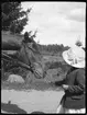 Bilden visar en finklädd kvinna sannolikt i Verkö herrgård. Hon bär ett halmhatt som är smyckat med en mössband från korvetten Saga.