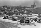 Finnboda Varf[Felaktigt registrerat. Fotografen har stått vid Danviksklippan och fotograferat ut över Hammarbybverken (fd ESABIS och Södra Varvets plåtslageri), till höger Danvikskanalen, Hammarby sjö rakt fram, Lumafabriken i fonden och de höga husen i bakgrunen finns vid Johanneshov och Årsta.] Foto senast 1951 då waxholmsbolagets ångf Nordan ligger vid kajen.