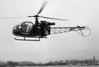 Bilden visar fyra Alouette och en vertol helikoptrar flygandes över en vinterlandskap.