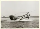 Transporthelikopter med tandem motor ovan vattenyta. Denna helikopter är även känd som "Bananen".