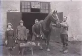 Smeden/hovslagare Folke Jönsson, Hornborga, skor hästen Docka på Heljesgården 1940-talet.