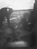Bilden visar besättningen på Ångkranpråmen som håller på med hummerfiske.