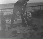Bilden visar en sjöman lägger hummer i en hink på däck.