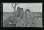 "Frida bär ett tungt köttlass." Humoristisk bild där Frida Fredriksson ligger på marken och tre vänninor sitter på henne.