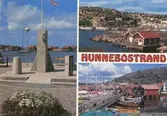 Tryckt text på kortet: "Hälsning från Hunnebostrand." "Sjöbodar, Solnedgång, Ryssjetork, Hunnebostrand, Kyrka."