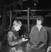Bilden föreställer en kvinna med en mikrofon som intervjuar kronprinsen Carl Gustaf, som står klädd i uniform. Bilden är tagen under minfartyget Älvsnabbens långresa 1966-1967.