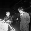 Ny Mercedes, Görtz intervjuer 21 januari 1966 På bilden syns bl.a. Storbritanniens och Tysklands flaggor, samt namnet "Ford." Man håller tal inför publik. Bilförsäljning.