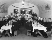 En Lucia sitter vid ett bord tillsammans med uniformsklädda militärer, bl. a. en löjtnant och en kapten. Lucian är klädd i vit skrud och bär på huvudet en ljuskrona. Tillsammans dricker de kaffe och äter lussebullar. På bordet står även en vas med blommor.