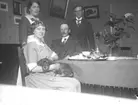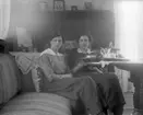 Tre kvinnor dricker kaffe i trädgården. De tre kvinnorna är fr. v. Beda Ulrika Katarina Bodén från Sundsvall, Margareta Lingman från Ren, Bollnäs och Sara Ericsson från Olles i Vik, Bollnäs.